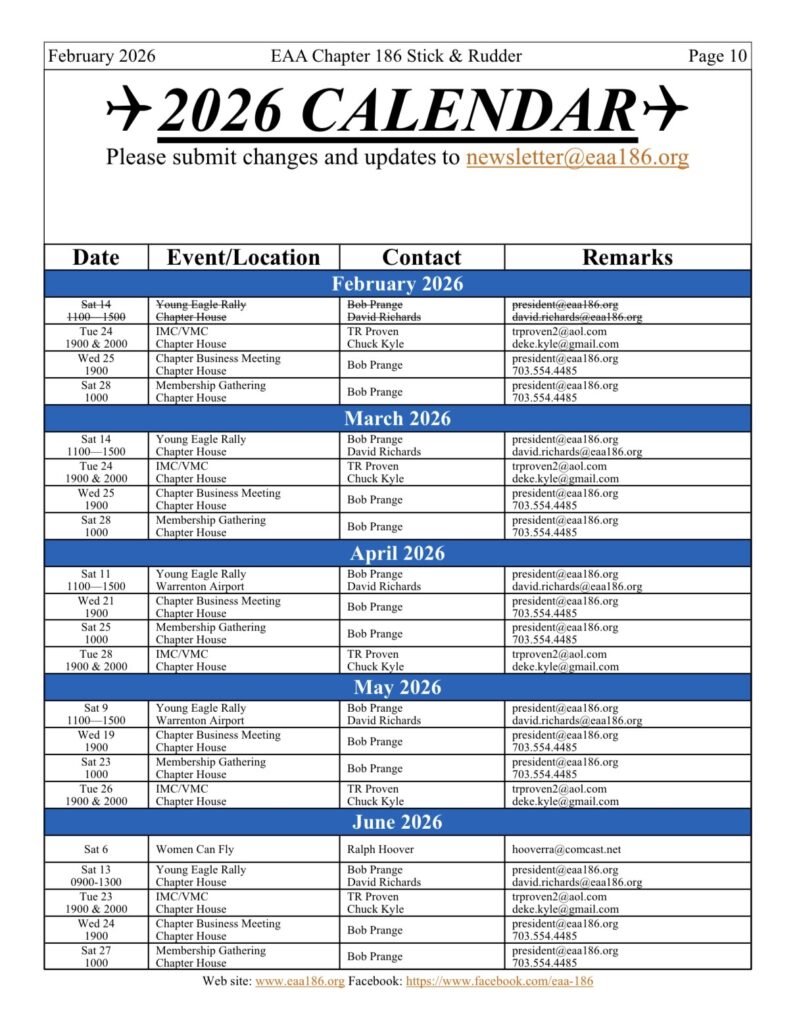 Ray Scholarship: We have applied to EAA to administer a 2026 Ray Foundation Aviation Scholarship. If we are selected to give another Ray Scholarship, we will begin a search in March for a motivated youth aged 16 1⁄2 to 19 who would like to participate in a concentrated one-year effort to acquire his/her Private Pilot License. Thank you to all the volunteers that keep this Chapter busy and visible. That helps us qualify to grant another Ray Scholarship each year.